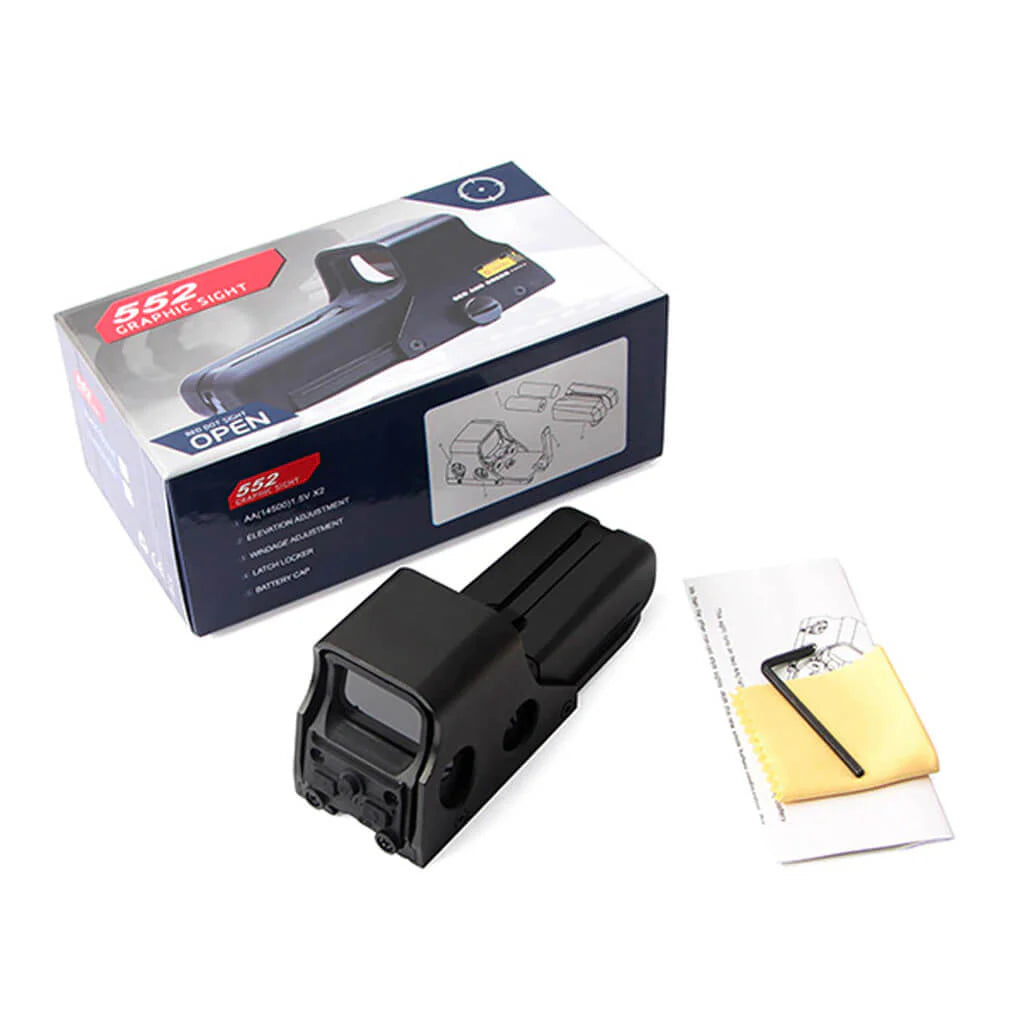 La mira holográfica 552 es un dispositivo de puntería avanzado, utilizado principalmente en armas de fuego y réplicas de airsoft o paintball para mejorar la precisión del disparo. A diferencia de otras miras ópticas, utiliza tecnología holográfica para proyectar una retícula iluminada que se superpone sobre el objetivo. Algunas de sus características más destacadas son: