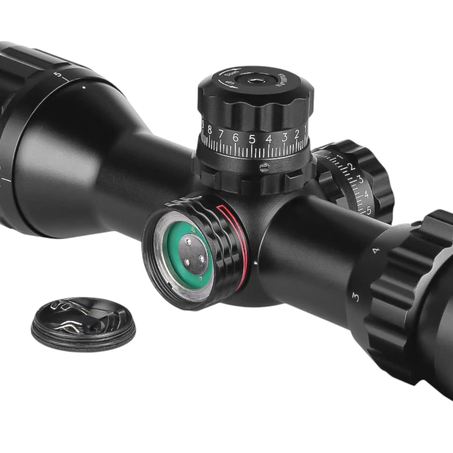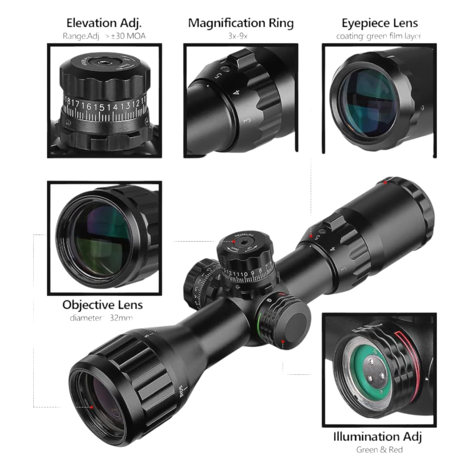 - Rango estimación de retícula de mil-puntos para un rendimiento óptimo de apuntar y disparar, objetivo ajustable de 3 yardas a infinito