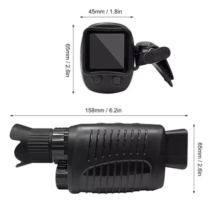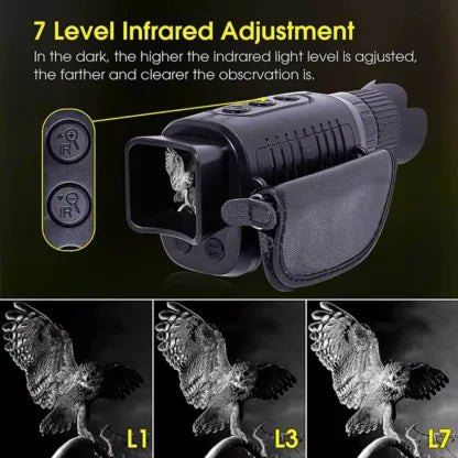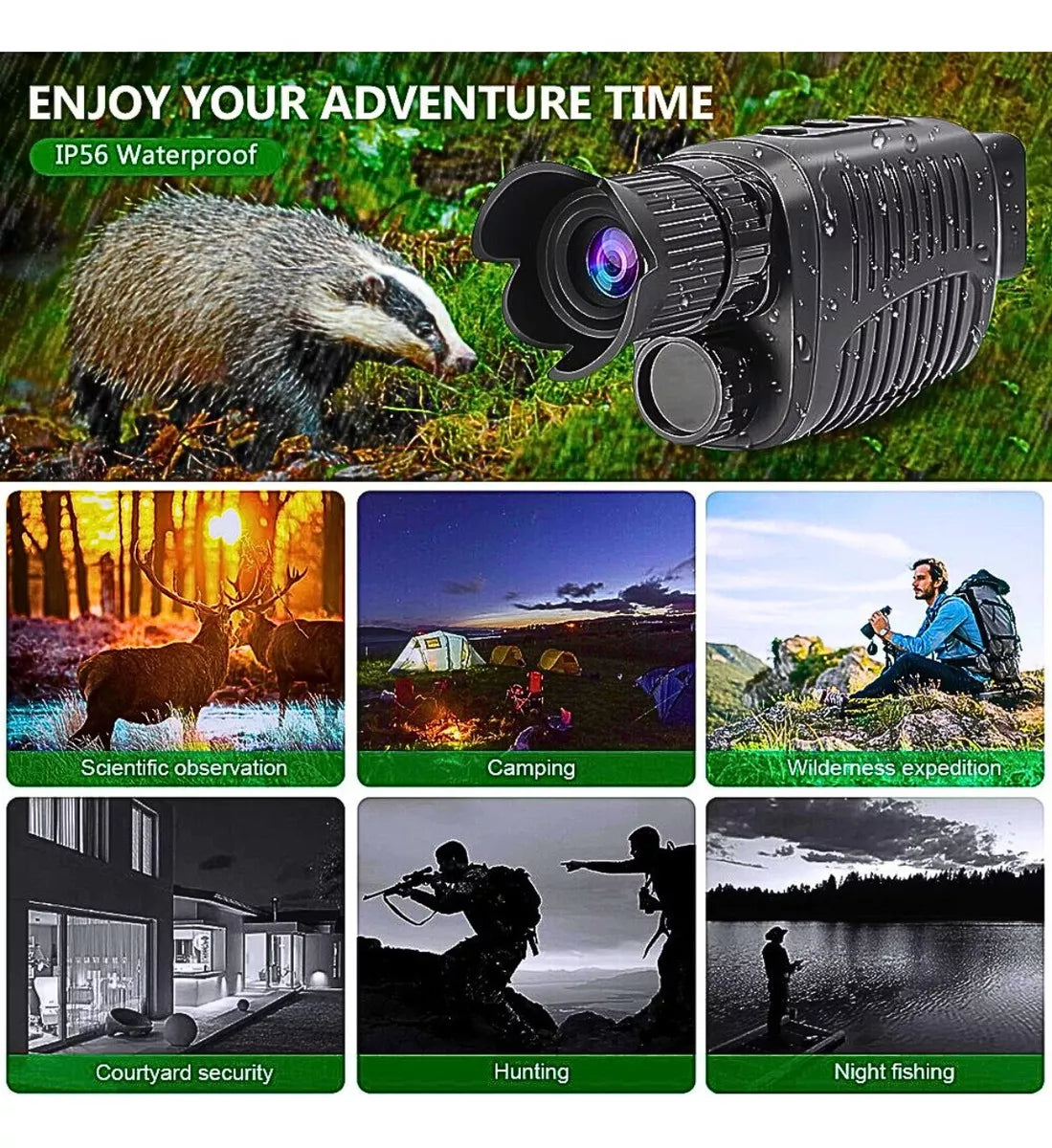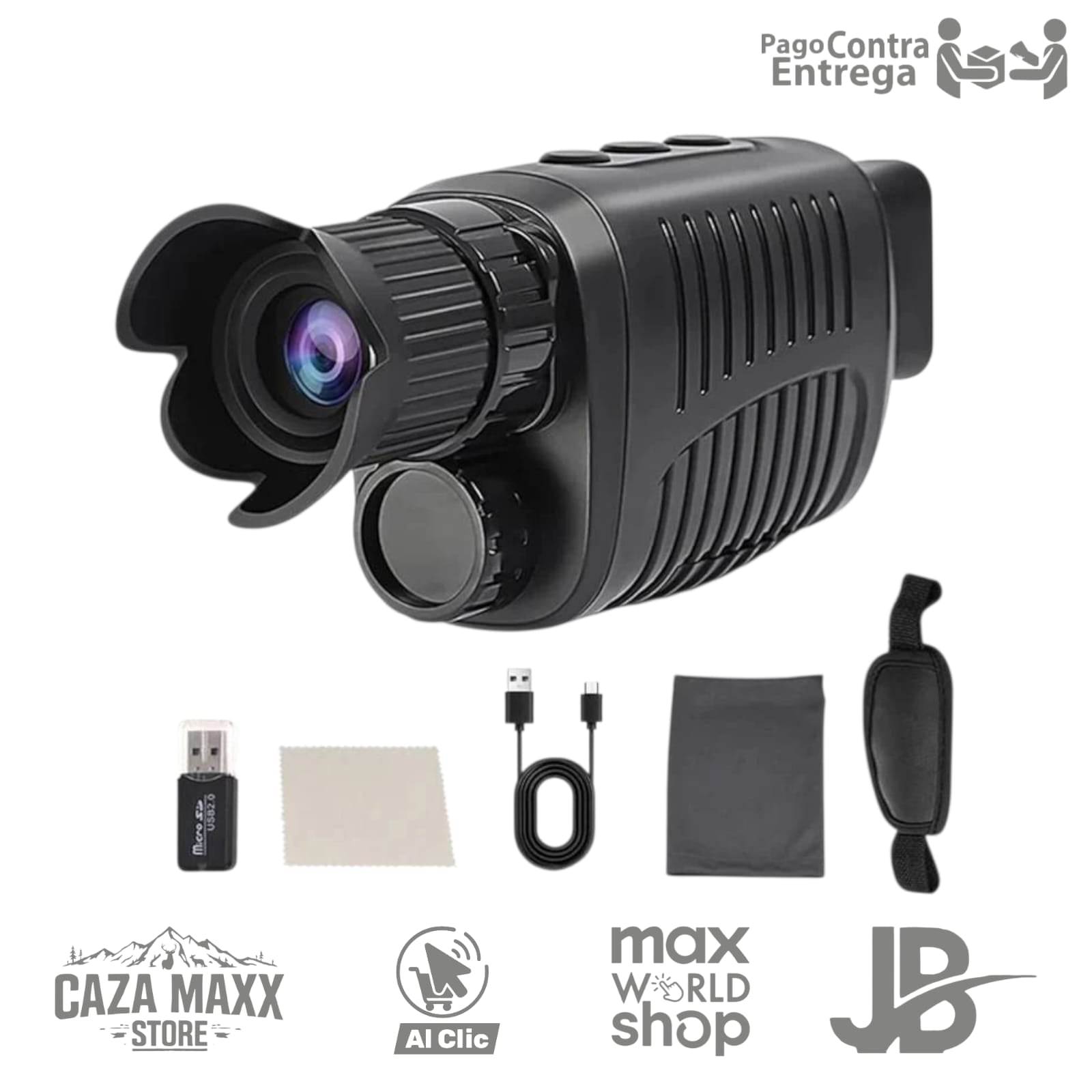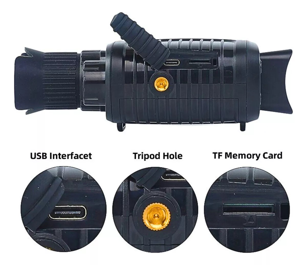 monocular con visión nocturna por infrarrojo puedes grabar vídeo con este visor para ello deberás meterle una memoria micro sd (no incluida) contiene visor nocturno, 1 cable de carga usb tipo c, 1 porta memoria, 1 funda de tela 1 pañito para limpiar el lente, 1 correa ajustable para que no se te salga de las manos cuando lo uses .